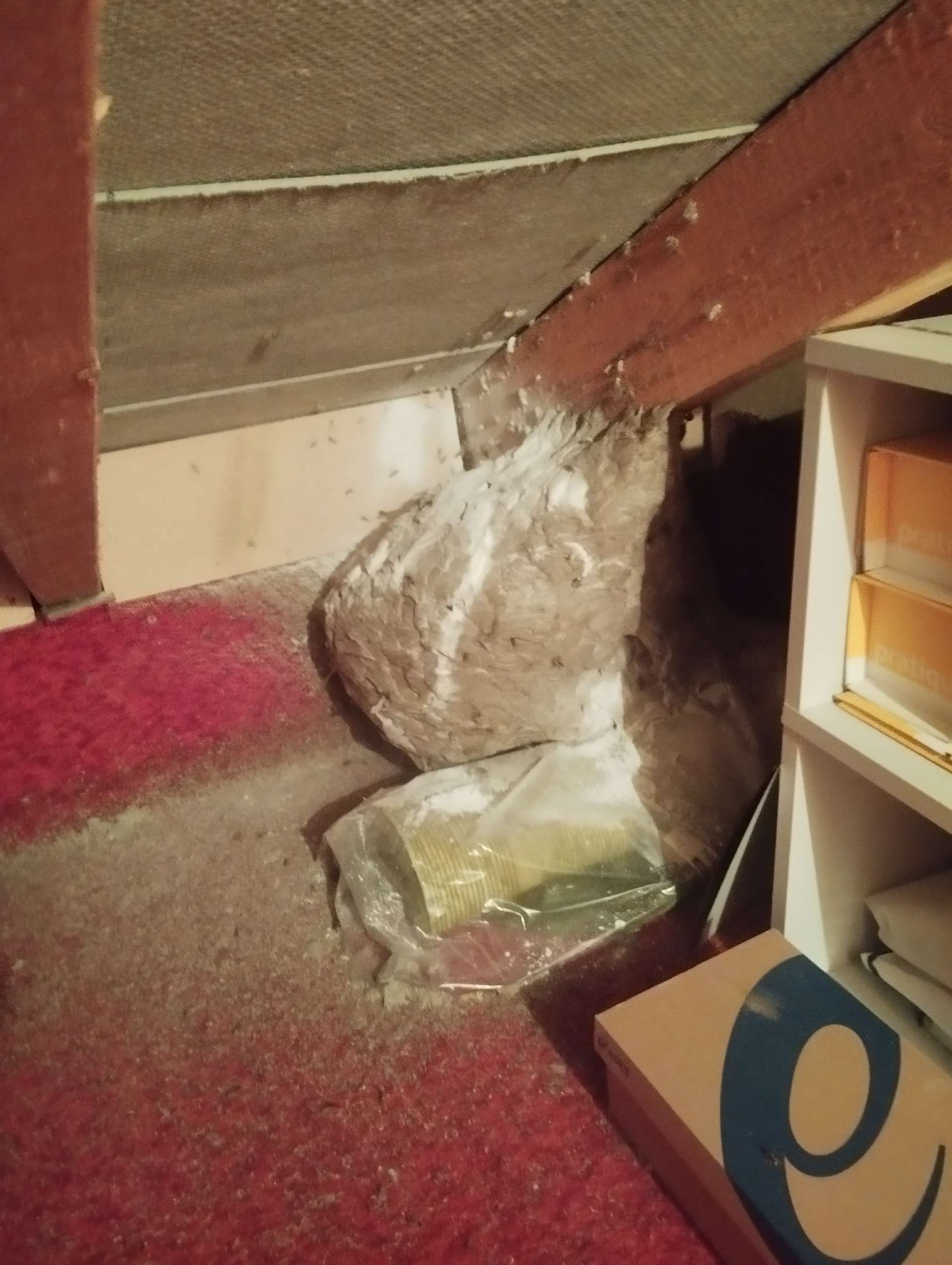5. Nid: Le nid du frelon asiatique se trouve souvent en hauteur dans les arbres, mais il peut également être souterrain ou dans des structures élevées comme les cheminées. Il a une forme ovale et est fabriqué à partir de bois mâché, ce qui donne au nid une structure semblable à du papier.