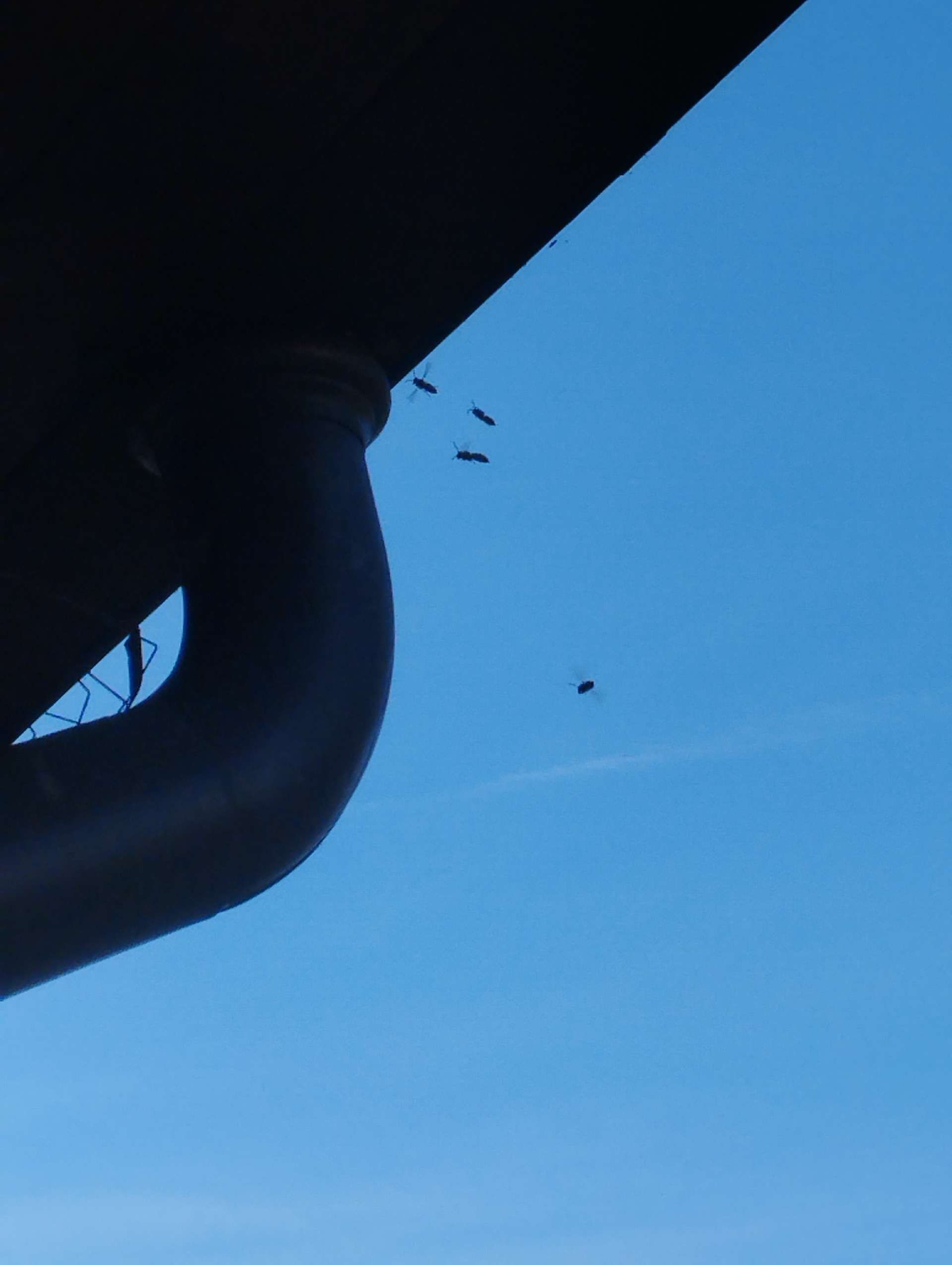4. Pattes: Le frelon asiatique a des pointes jaunes sur les pattes, ce qui est une caractéristique distinctive lorsqu'il vole.